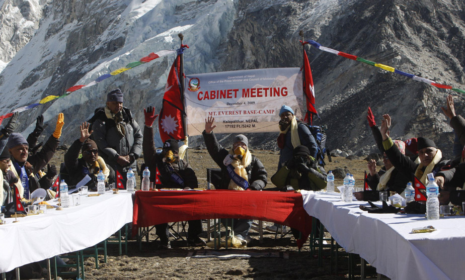 12月4日,尼泊爾總理和22位部長(zhǎng)在喜馬拉雅山海拔5262米的高度舉行內(nèi)閣會(huì)議,討論全球變暖對(duì)喜馬拉雅山的影響。呼吁人們切實(shí)采取行動(dòng),保護(hù)環(huán)境。