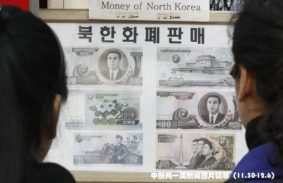 12月1日,韓國(guó)板門(mén)店一側(cè)的韓國(guó)游客正在一塊展板前看新出的朝鮮貨幣。據(jù)朝鮮官員當(dāng)日對(duì)外透露,朝鮮于11月30日更換了貨幣,這是該國(guó)十七年來(lái)首次更換貨幣。新舊貨幣兌換率為100比1。圖片來(lái)源:中國(guó)新聞網(wǎng)
