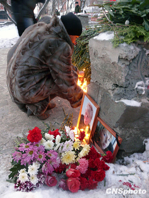 十二月六日,在俄羅斯彼爾姆市夜總會火災(zāi)事故現(xiàn)場,一位俄羅斯婦女點(diǎn)燃蠟燭,悼念自己的親人。中新社發(fā) 田冰 攝