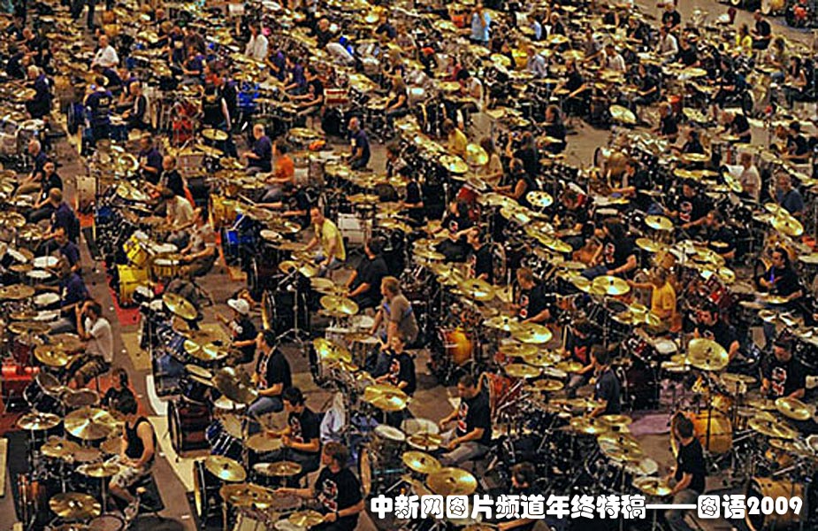 世界最多的鼓手同時(shí)打鼓:582名架子鼓手齊聚一堂,同時(shí)擊打同樣的鼓點(diǎn)長(zhǎng)達(dá)5分鐘,和諧程度如出自一人之手,令人咋舌,同時(shí)也創(chuàng)下了又一項(xiàng)新的吉尼斯世界紀(jì)錄。圖片來源:中國(guó)新聞網(wǎng)
