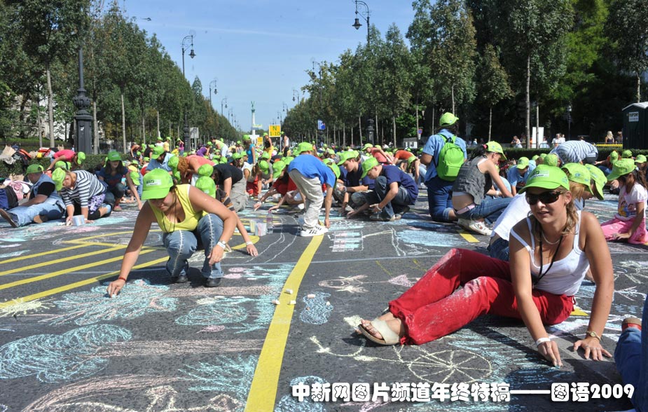 最多參加的粉筆畫:9月20日,世界無車日,在匈牙利首都布達(dá)佩斯的一條街道上5317人同時(shí)參加粉筆畫制作,打破了以前的吉尼斯世界紀(jì)錄。圖片來源:中國新聞網(wǎng)