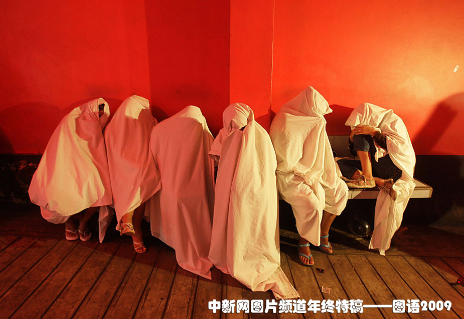 11月30日,秘魯首都利馬,來自紅燈區(qū)的性工作者準(zhǔn)備接受HIV檢測。她們大多以白布蒙面。