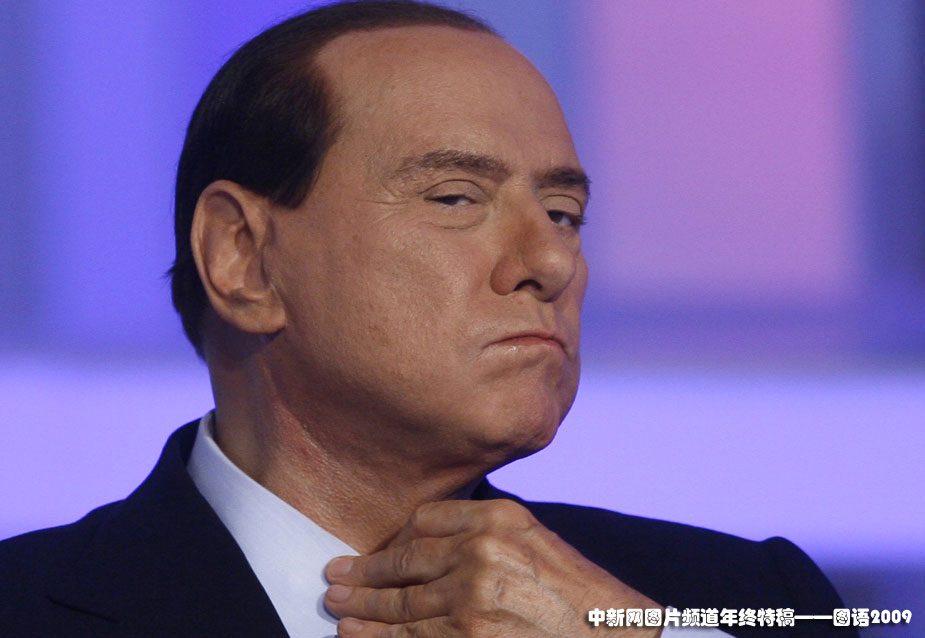 瀟灑的貝魯斯科尼:2009年9月25日,意大利總理貝魯斯科尼在接受電視采訪時(shí)整理領(lǐng)帶。貝魯斯科尼一直緋聞纏身,妻子也離他而去。
