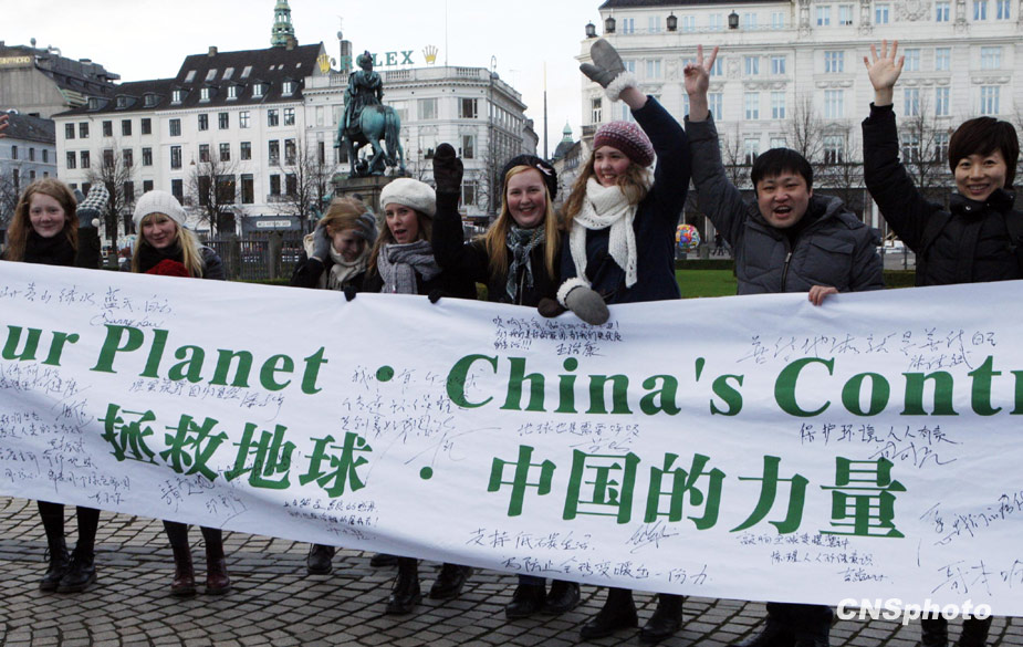 12月12日,正在丹麥哥本哈根召開(kāi)的聯(lián)合國(guó)氣候會(huì)議舉行部分與會(huì)國(guó)會(huì)外會(huì)議,500多個(gè)來(lái)自70多個(gè)國(guó)家和組織的成員以及當(dāng)?shù)丨h(huán)保者6萬(wàn)多人匯集哥本哈根市貝拉會(huì)展中心進(jìn)行大游行。圖為在哥本哈根環(huán)保大游行醒目的中國(guó)“環(huán)保先鋒行活動(dòng)”。 中新社發(fā) 錢興強(qiáng) 攝