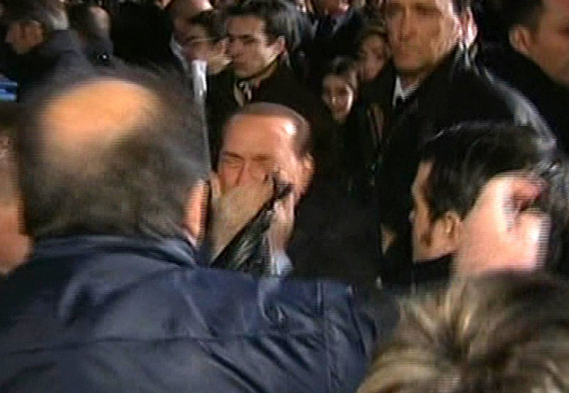 時值政治盟友沖刺階段,貝盧斯科尼照例參加自己黨派的集會。就在他給支持者簽名時,人群中一名中年男子突然毆打其面部。當(dāng)?shù)仉娨暸_畫面顯示,跌倒在地的貝盧斯科尼被助手扶起時,口鼻出血,面部淤青,表情痛苦。
