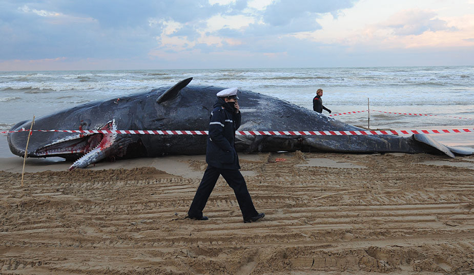 一群抹香鯨12月12日在意大利南部海灘擱淺,其中至少5頭已經死亡。據(jù)稱,這群抹香鯨共有9頭,其中有2頭經過救援已成功游回大海,目前相關人員對另外2頭正在進行救援。圖片來源:中國新聞網
