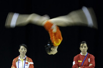 世界田徑錦標賽賽場上,古巴選手薩維涅以14米95的成績獲得女子三級跳遠的金牌。