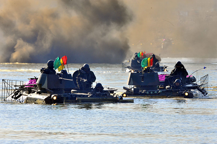 12月16日,韓國第20師團機械化部隊在京畿道驪州南漢江一帶進行大規(guī)模渡河實戰(zhàn)訓練。該訓練以培養(yǎng)戰(zhàn)斗執(zhí)行能力為重點。圖片來源:中國新聞網(wǎng)