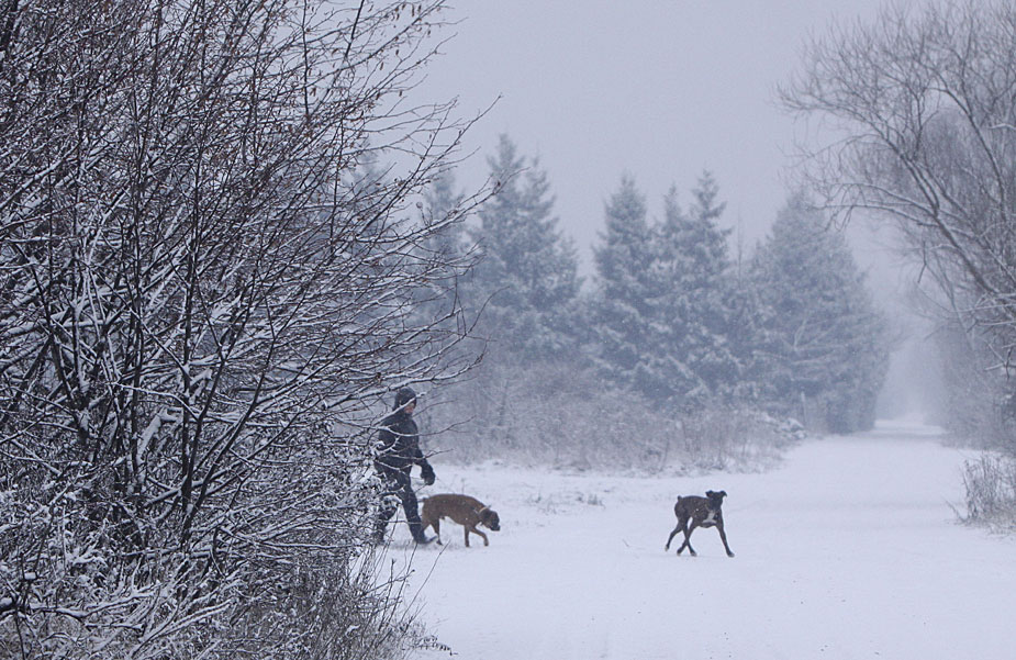 圖為12月29日,波蘭首都華沙人們在雪中溜狗。