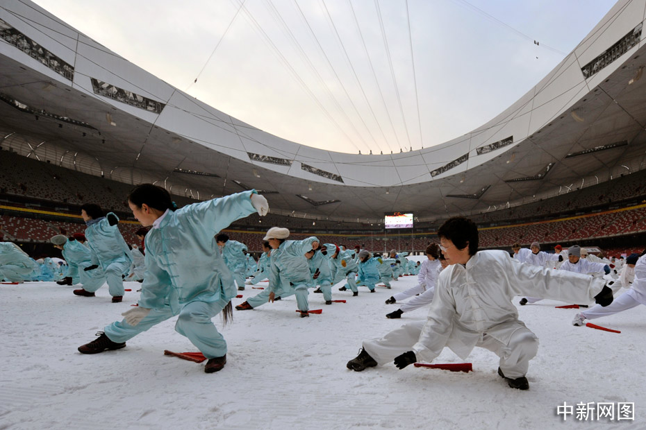 2010年1月1日上午,2010人在被冰雪覆蓋的鳥(niǎo)巢內(nèi)表演了太極拳、武功扇等民族傳統(tǒng)健身項(xiàng)目。中新網(wǎng)記者 金碩 攝