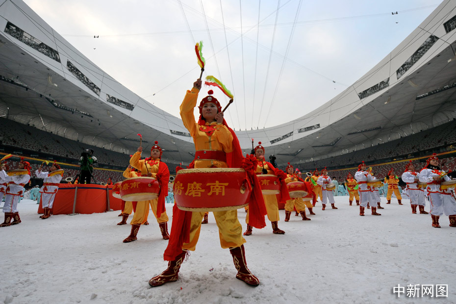 2010年1月1日上午,2010人在被冰雪覆蓋的鳥巢內(nèi)表演了太極拳、武功扇等民族傳統(tǒng)健身項(xiàng)目。中新網(wǎng)記者 金碩 攝