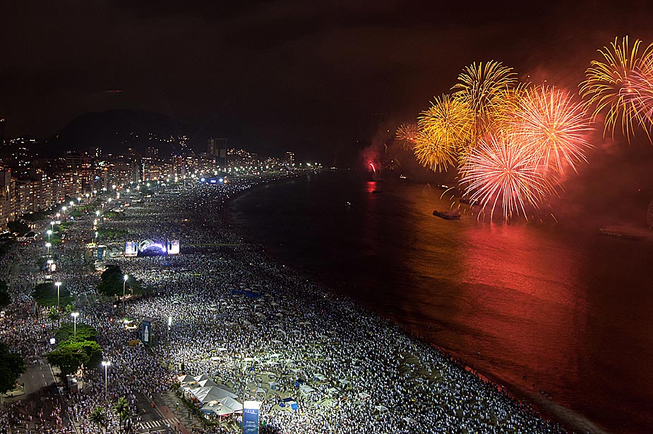 圖為2010年1月1日,巴西里約熱內(nèi)盧的科帕卡巴納海灘燃放煙花,引來(lái)大量游客觀看。