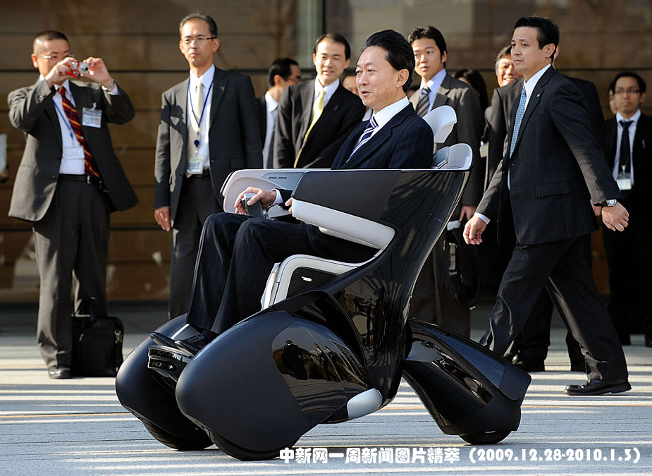 周三(30日),日本首相鳩山由紀夫抵達日本某公司試駕該公司生產(chǎn)的“i-Real”單人用交通工具。“i-Real”由輕質的碳纖維和塑膠制成,控制方式由傳統(tǒng)汽車的方向盤操作改為兩側手臂休息處的控制面板,最高時速可達18.6英里/時。圖片來源:中國新聞網(wǎng)