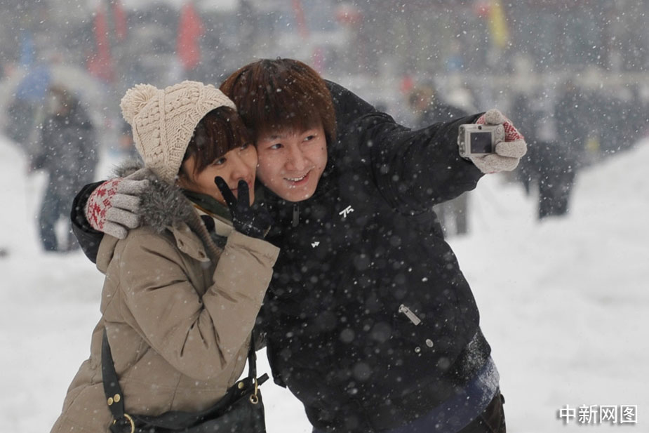 1月3日,一對情侶在時(shí)剎海冒雪合影。中新網(wǎng)記者 金碩 攝