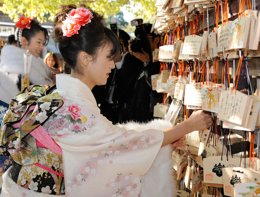 日本年輕女孩穿和服祈福迎接成人節(jié)