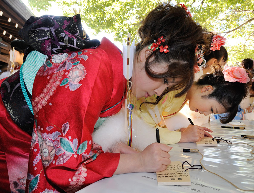 今年的1月11日,是日本傳統(tǒng)的成人節(jié),所有滿20歲的年輕人將宣告自己邁進(jìn)了成人行列。1月8日,日本一家公司年滿20歲的年輕女孩紛紛穿上和服,到廟宇中祈福,提前慶祝成人節(jié)的到來。