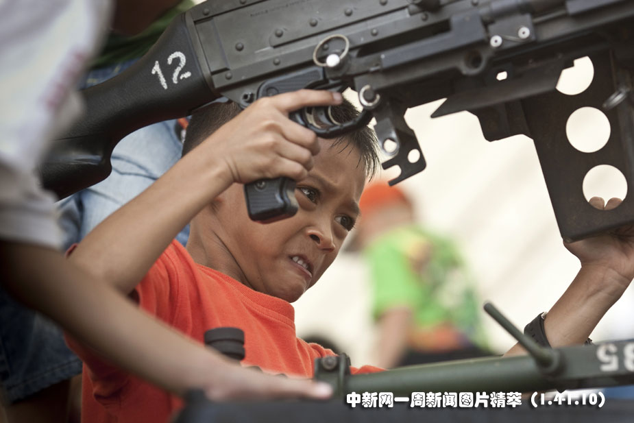 1月9日(周六),當(dāng)天是泰國的兒童節(jié),一名男孩正在體驗(yàn)沒有裝彈的機(jī)槍。圖片來源:中國新聞網(wǎng)