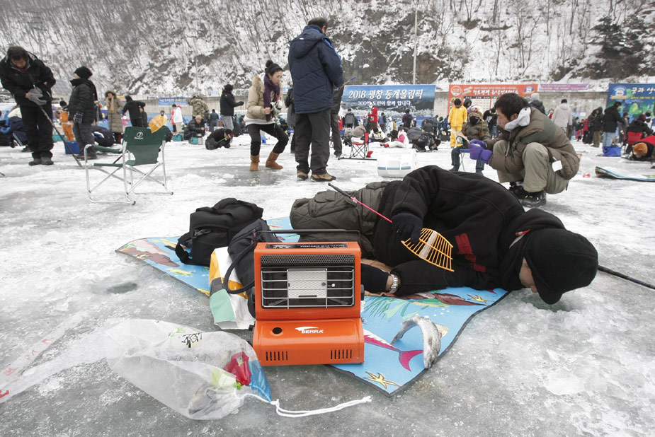 2010年1月9日,韓國華川郡,一年一度的華川山鱒魚節(jié)當(dāng)日舉行。數(shù)千游客在此“破冰”比賽釣鱘魚。該活動每年都會吸引上百萬游客前來。