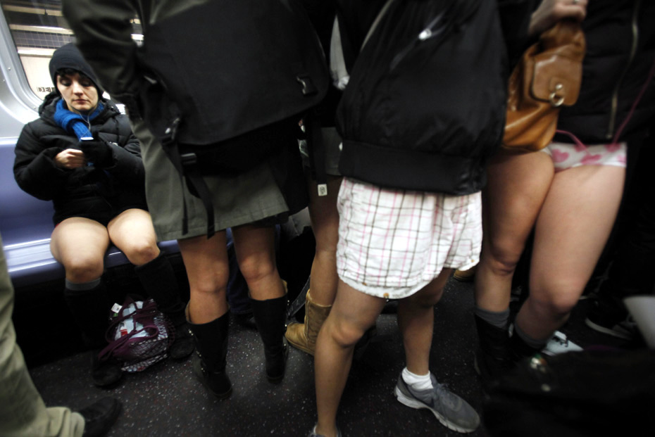 2010年1月10日,紐約,地鐵里一群不穿褲子的乘客。第9屆“不穿褲子乘地鐵”活動(dòng)當(dāng)日在全球16個(gè)國(guó)家的44座城市舉行。圖片來源:中國(guó)新聞網(wǎng)