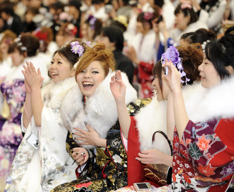 1月11日,日本迎來2010年的成人節(jié)日,所有年滿20歲的年輕人都將在這一天宣告自己邁進了成人行列。眾多年輕的日本女孩身穿和服在東京迪斯尼樂園里快樂游玩,迎接自己的節(jié)日。圖片來源:中國新聞網(wǎng)