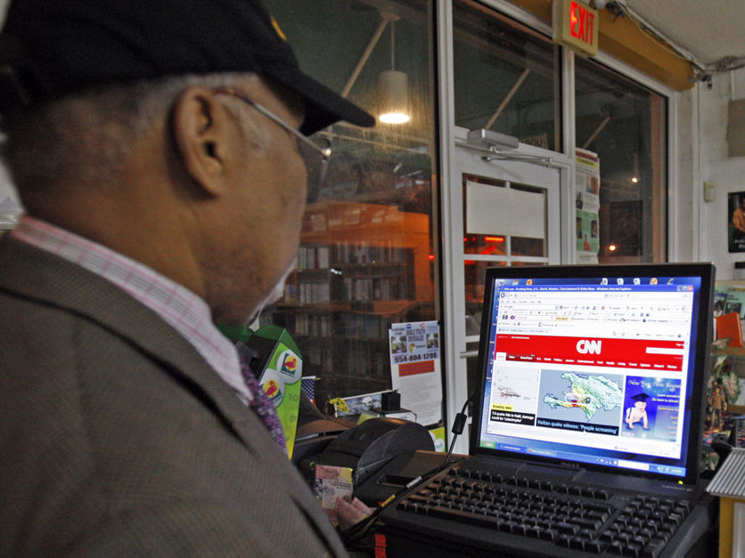 當(dāng)?shù)貢r間12日下午,海地發(fā)生7.0級強烈地震,多座建筑損毀。在美國邁阿密,一位民眾通過網(wǎng)絡(luò)查看海地大地震的消息。