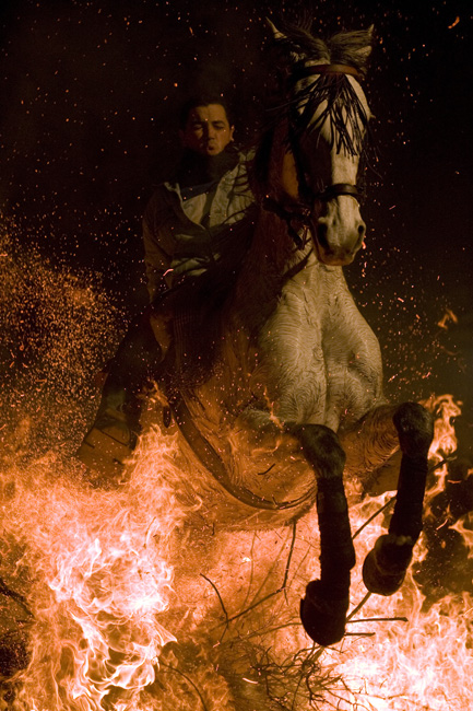 1月16日,西班牙一小村莊舉行一年一度的圣安東尼贖罪節(jié),勇敢的騎士們騎上心愛的坐騎穿過熊熊燃燒的火堆。 圖片來源:中國新聞網(wǎng)