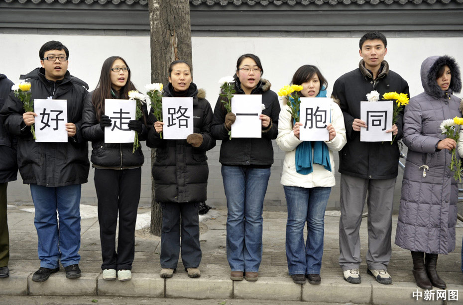 1月19日,北京民眾自發(fā)守候在通往北京八寶山殯儀館的路口迎接英烈的靈柩。當(dāng)日,八位海地地震遇難中國(guó)維和警察的靈柩搭乘專機(jī)將抵達(dá)北京。中新網(wǎng)記者 金碩 攝