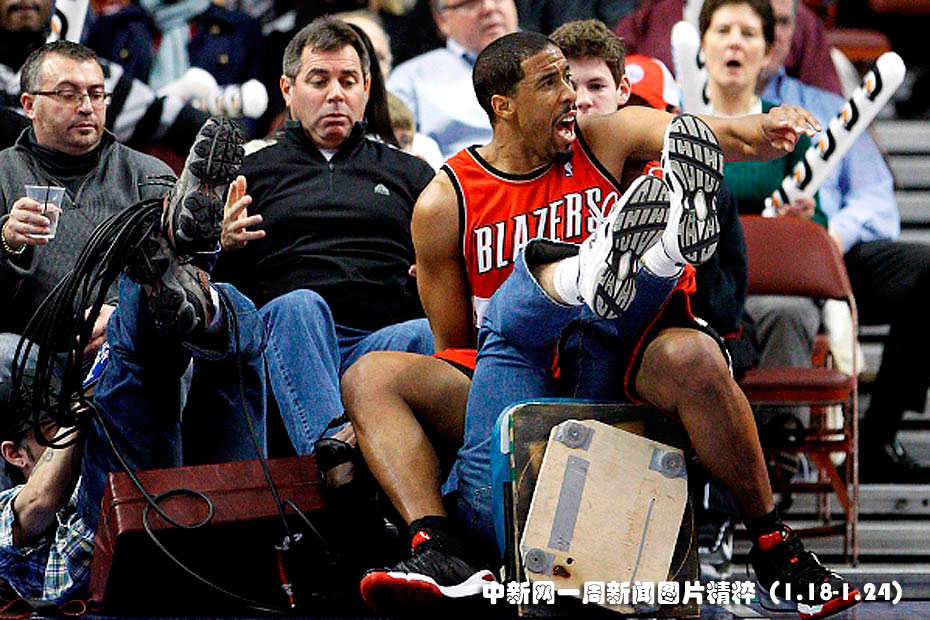 1月20日,波特蘭開(kāi)創(chuàng)者隊(duì)后衛(wèi)米勒在客場(chǎng)對(duì)陣費(fèi)城76人隊(duì)的比賽中搶球撞上場(chǎng)邊的電視臺(tái)工作人員。波特蘭開(kāi)創(chuàng)者最終以98比90擊敗費(fèi)城76人隊(duì)。圖片來(lái)源:中國(guó)新聞網(wǎng)