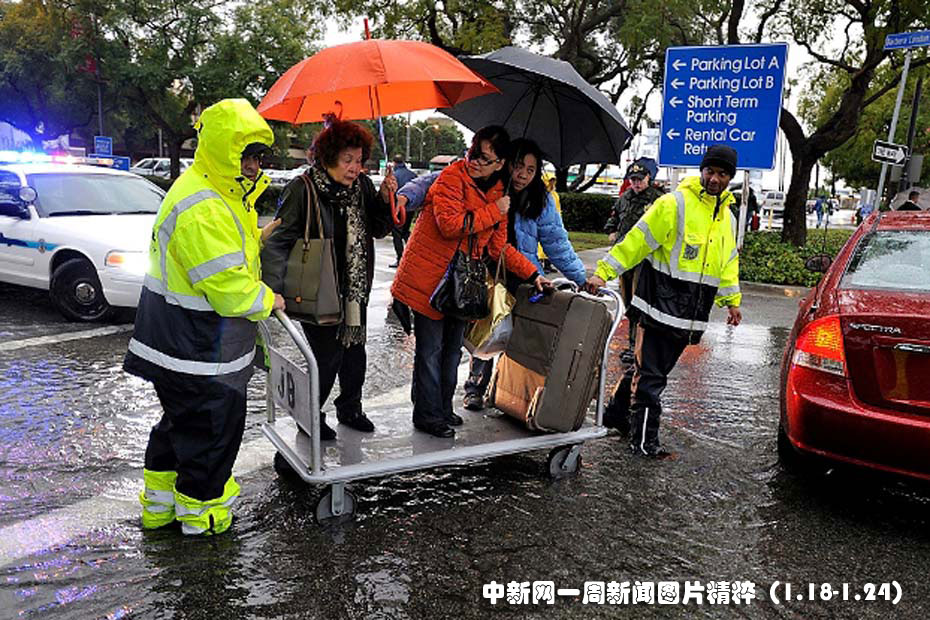 1月20日,在近期遭受暴風雨襲擊的加州長灘地區(qū),捷藍航空公司工作人員幫助乘客穿過被水淹沒的機場停車場。圖片來源:中國新聞網(wǎng)