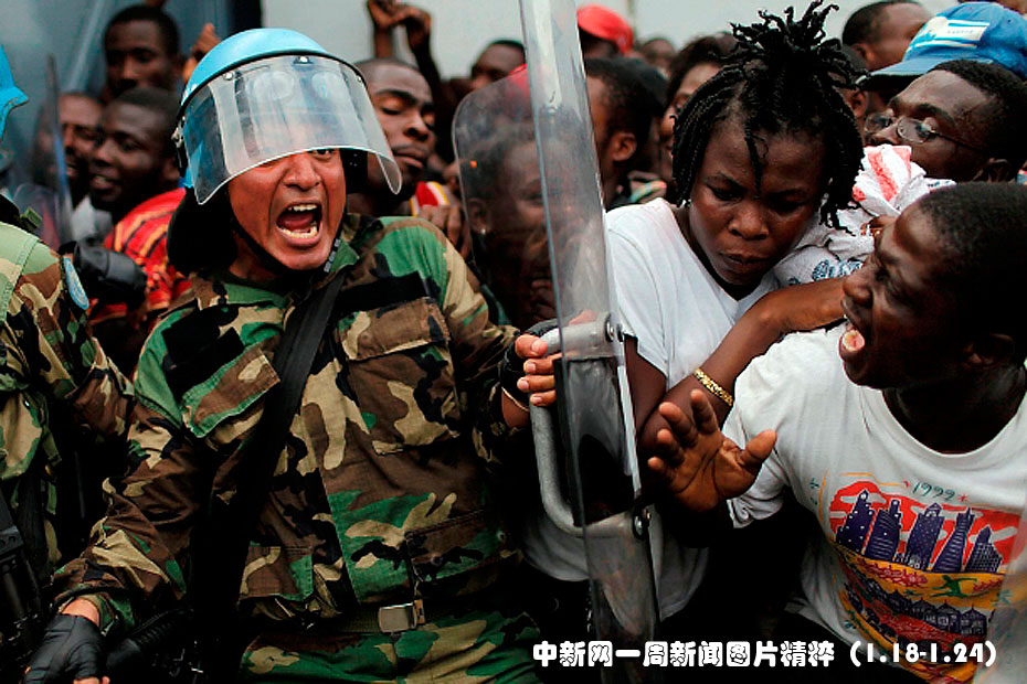 1月19日,在海地太子港,一名秘魯維和人員在試圖控制食品發(fā)放過(guò)程中混亂的人群時(shí)發(fā)出尖叫。圖片來(lái)源:中國(guó)新聞網(wǎng)