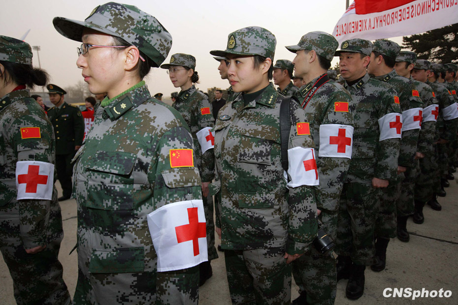 中國(guó)人民解放軍醫(yī)護(hù)人員和管理人員組成的中國(guó)醫(yī)療防疫救護(hù)隊(duì)一行40人乘坐軍運(yùn)包機(jī)離開(kāi)北京,啟程前往海地進(jìn)行人道主義救援任務(wù)。中新社發(fā) 劉震 攝