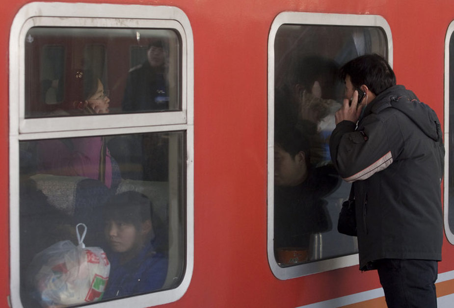 一年一度的春運今日起正式開始。2010年的春運從1月30日起至3月10日,為期40天,其中節(jié)前15天,節(jié)后25天。據(jù)權(quán)威預(yù)測,今年春運客運量料超25億人次。圖為一個男子在和已經(jīng)上了車的女朋友打電話,囑咐她看好行李。吳家翔 攝