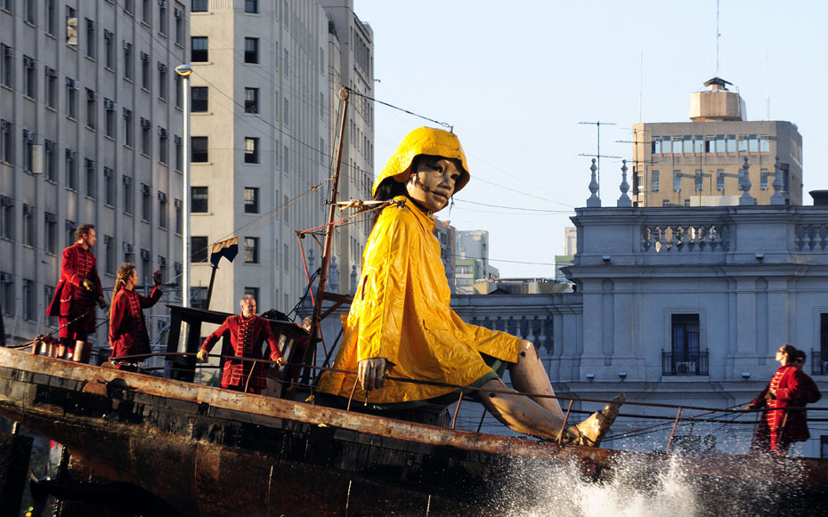 近日,智利首都圣地亞哥街頭,法國(guó)一劇團(tuán)攜巨型提線木偶“小巨人”上街表演,它惟妙惟肖的表情和逼真的神態(tài)引得周?chē)^眾的陣陣掌聲。圖片來(lái)源:中國(guó)新聞網(wǎng)