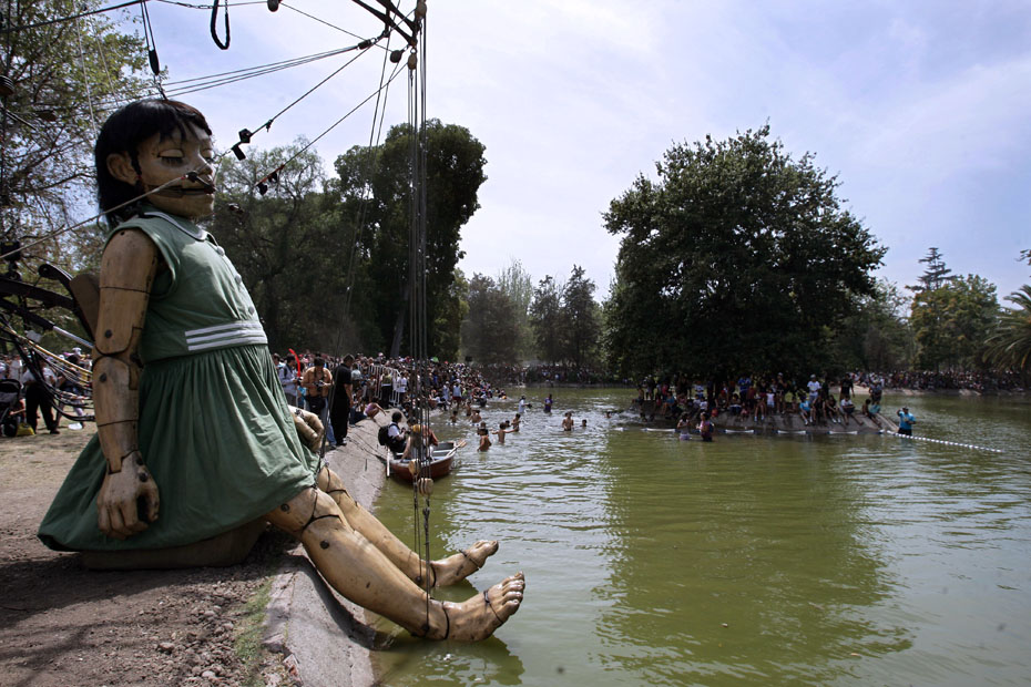 近日,智利首都圣地亞哥街頭,法國一劇團(tuán)攜巨型提線木偶“小巨人”上街表演,它惟妙惟肖的表情和逼真的神態(tài)引得周圍觀眾的陣陣掌聲。圖片來源:中國新聞網(wǎng)