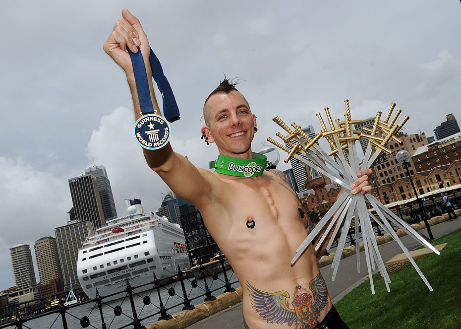 2月8日,街頭藝人Chayne Hultgren在澳大利亞悉尼海港大橋前,一次吞下18把厚約1.3厘米,長(zhǎng)約50.8厘米的長(zhǎng)劍,刷新了吉尼斯世界紀(jì)錄。圖片來(lái)源:中國(guó)新聞網(wǎng)