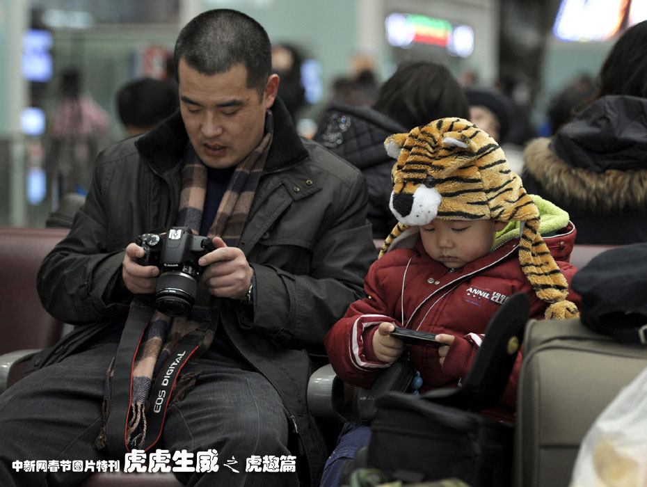2月7日,北京南站一名頭戴虎帽的孩子和父親在等待回家的火車(chē)。