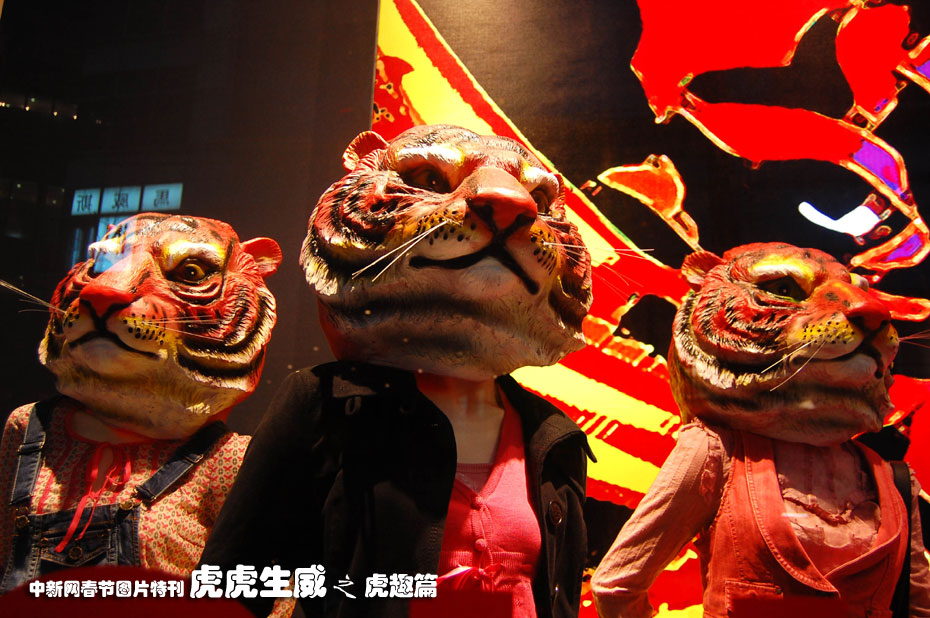 1月31日,上海市西藏中路的一家商店櫥窗中,服裝模特的頭變成了老虎頭,商家以“虎哥虎姐”吸引顧客前往購(gòu)物。隨著春節(jié)的臨近,各大商家紛紛推出各類“虎年促銷”,吸引顧客消費(fèi)。中新社發(fā) 許康平 攝