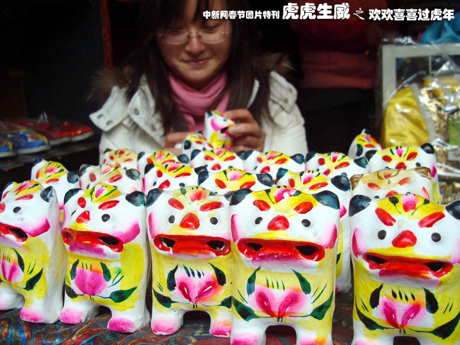 1月15日,虎年臨近,蘇州山塘街民間藝人制作的傳統(tǒng)玩具“皮老虎”引起了許多市民和游人的濃厚興趣!捌だ匣ⅰ笔翘K州民間傳統(tǒng)玩具,用膠泥燒制虎頭與虎尾,中間用軟羊皮將虎身粘合,在虎口中置一哨,用手輕輕一拉一合,便可發(fā)出悅耳動(dòng)聽(tīng)的皮虎歌唱。中新社發(fā) 王建康 攝