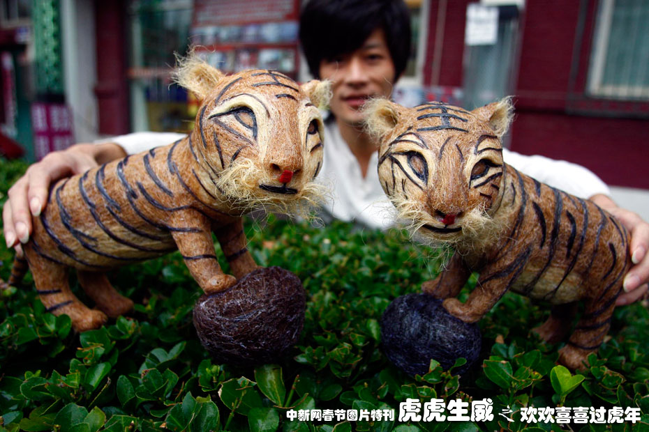 2009年11月9日,北京一位時尚發(fā)型設(shè)計師正在展示頭發(fā)絲作品“福虎神威”賀歲虎年。這是祖國60華誕之后的又一新作,四川青年理發(fā)師黃鑫用2.6公斤碎頭發(fā)制作了一對可愛逼真的“;ⅰ,歷時兩個多月的時間才完工。中新社發(fā) 鄭雄增 攝