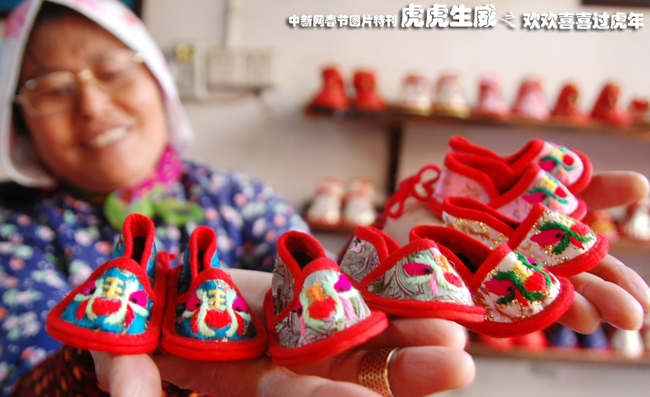 元旦佳節(jié),蘇州周莊風(fēng)景區(qū)內(nèi)的文化街市上“迷你”虎鞋俏銷(xiāo);⒛甑搅嗽诮系貐^(qū)民間有著“虎年到送虎鞋”的傳統(tǒng)習(xí)俗,集市上造型別致的“虎頭鞋”格外受到游客和市民們的青睞。 中新社發(fā) 蘇民 攝