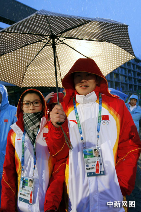 當?shù)貢r間2月10日,中國代表團在溫哥華冬奧會奧運村舉行升旗儀式。升旗儀式結束后,中國代表團團長劉鵬帶領代表團成員展開橫幅高聲向全體國人送上新春祝福。中新社記者 盛佳鵬 攝