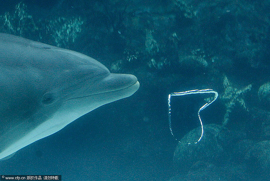 近日,美國奧蘭多海洋世界的一只寬吻海豚吹出“心形”氣泡,似乎要在情人節(jié)來臨前夕傳達(dá)濃濃愛意。圖片來源:CFP