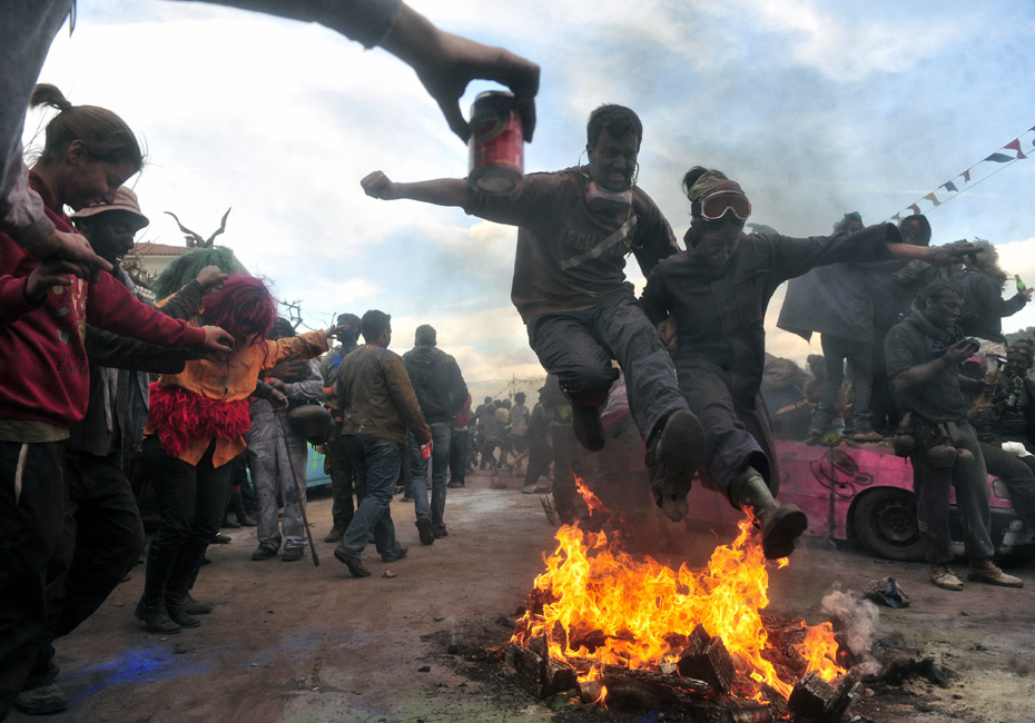 2月15日,希臘港口加拉西迪,狂歡者在街頭參加“面粉大戰(zhàn)”!懊娣鄞髴(zhàn)”是當(dāng)?shù)貞c祝狂歡季結(jié)束的一項(xiàng)傳統(tǒng)活動(dòng),隨后將是為期40天的齋戒月直至復(fù)活節(jié)。圖片來(lái)源:中國(guó)新聞網(wǎng)