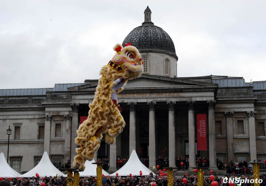 當(dāng)?shù)貢r(shí)間2月21日,亞洲之外最大規(guī)模的春節(jié)慶;顒(dòng)——倫敦春節(jié)慶典在倫敦特拉法加廣場、萊斯特廣場及倫敦華埠舉行,圖為當(dāng)?shù)貎S社舞獅團(tuán)表演的“梅花樁”,令現(xiàn)場數(shù)萬觀眾發(fā)出驚嘆。 中新社發(fā) 魏群 攝
