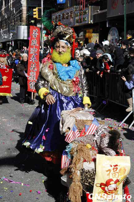 虎年紐約華埠慶祝農(nóng)歷新年“重頭戲”花車大游行21日登場,吸引超過10萬人圍觀共同狂歡,成為歷年來參加人數(shù)最多的一次花車游行。12輛盛裝花車以及數(shù)千人的表演團(tuán)隊沿著華埠最熱鬧的數(shù)十條街道一邊行進(jìn)一邊表演,滿天彩帶飄揚,場面熱鬧非常。圖為游行隊伍中奇裝異服的美國人。