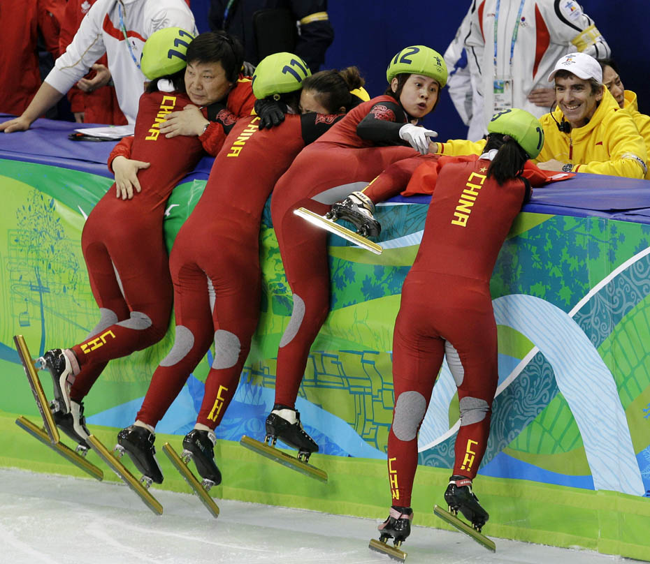 當(dāng)?shù)貢r(shí)間2月24日,溫哥華冬奧會(huì)女子短道速滑3000米接力A組決賽中,中國(guó)隊(duì)王濛、周洋、孫琳琳、張會(huì)四朵金花聯(lián)袂出擊,最終將金牌歸入中國(guó)隊(duì)囊中。圖片來源:中國(guó)新聞網(wǎng)