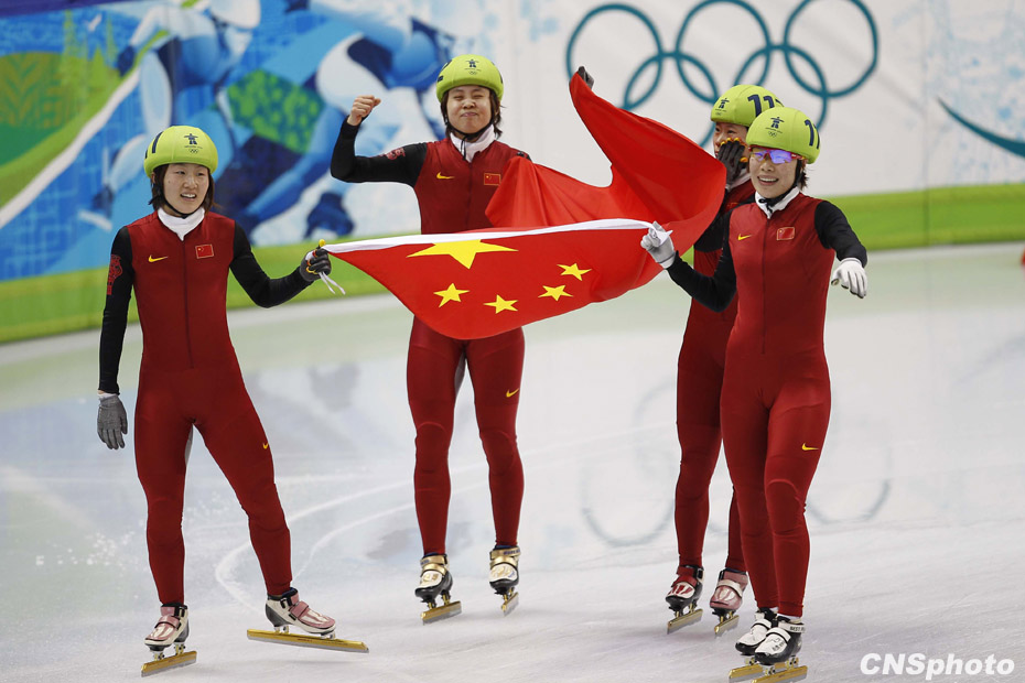 當(dāng)?shù)貢r(shí)間2月24日,溫哥華冬奧會(huì)女子短道速滑3000米接力A組決賽中,中國(guó)隊(duì)王濛、周洋、孫琳琳、張會(huì)四朵金花聯(lián)袂出擊,最終將金牌歸入中國(guó)隊(duì)囊中。圖片來(lái)源:中國(guó)新聞網(wǎng)