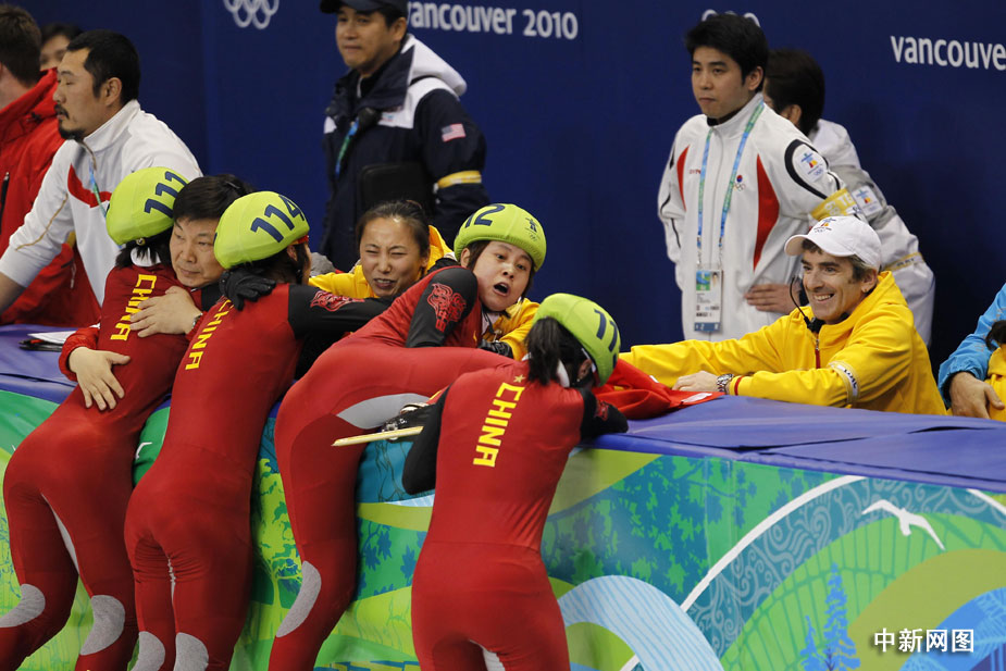 在裁判宣布韓國隊(duì)犯規(guī)后,一直等候著最終結(jié)果的中國姑娘忘情地?fù)湎蚪叹毾。圖片清楚地顯示,興奮的王濛撲到教練李琰前面寬寬的防護(hù)墊上,她的右腿無意間高高抬起,冰刀刮到了跟在她身后的張會(huì)的下巴。王濛意識(shí)到自己闖了禍,馬上關(guān)切地回頭察看張會(huì)的傷情。四位姑娘舉著國旗慶祝勝利時(shí),張會(huì)用手捂著她的下巴,漸漸地鮮血浸濕了她的手套。