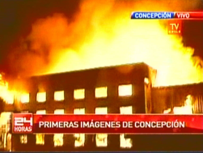美國地震勘測局報告稱,智利康塞普西翁省附近當?shù)貢r間27日凌晨發(fā)生里氏8.8級強烈地震,首都圣地亞哥有明顯震感。智利總統(tǒng)巴切萊特已宣布國家進入“災難狀態(tài)”。目前強烈地震造成的死亡人數(shù)已經(jīng)升至78人。視頻截圖顯示在智利康塞普西翁,地震破壞嚴重,火光沖天。
