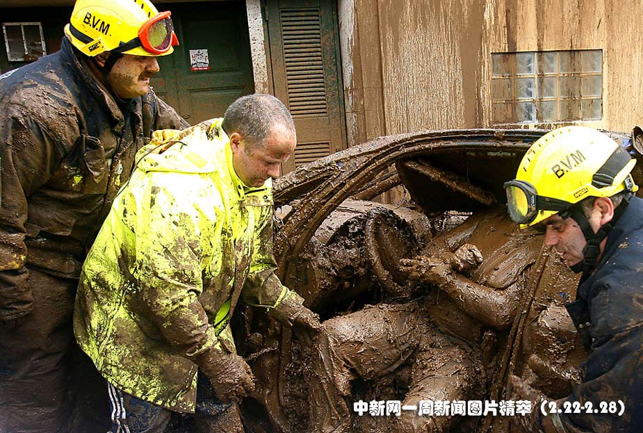 22日(周一),在葡萄牙馬德拉島豐沙爾市,救援人員在移出車(chē)廂內(nèi)的遇難者遺體。當(dāng)?shù)卣硎,由洪?zāi)引發(fā)的泥石流導(dǎo)致42人死亡,32人失蹤。